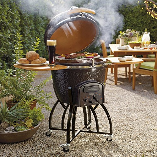 Ideal for smoking, grilling, and more, the Vision Grills Professional C Series Super Bundle Kamado Grill is an indispensable backyard cooking tool. Its two-level cooking grates (made out of chrome steel) provide a maximum cooking area and make allowance for simple addition of lump charcoal and picket chips when smoking. Monitor the temperature with the hood-mounted thermometer and make adjustments with the highest draft vent (with smoker knob) and bottom draft vent (with both smoker and grilling knobs, a starter port, and a removable ash drawer for fast clean up). The body of the unit is made out of long lasting ceramic with a timeless Kamado design that circulates heat for even, quick cooking. The Kamado design makes efficient use of your fuel, reducing consumption and making it overall more eco-friendly. The frame is crafted from durable steel with four casters for mobility (two casters lock for stability). A protective vinyl weather cover is included with Velcro closures. Dimensions: 29W x 29D x 43H in.. 2-tiered grates for 604 square-inch cooking area. Solid steel frame with caster wheels. Outer body and firebowl made out of ceramic. Most well-liked to be used with lump charcoal. Weighs in at 227 lbs.. Hood includes a built-in temperature gauge.
